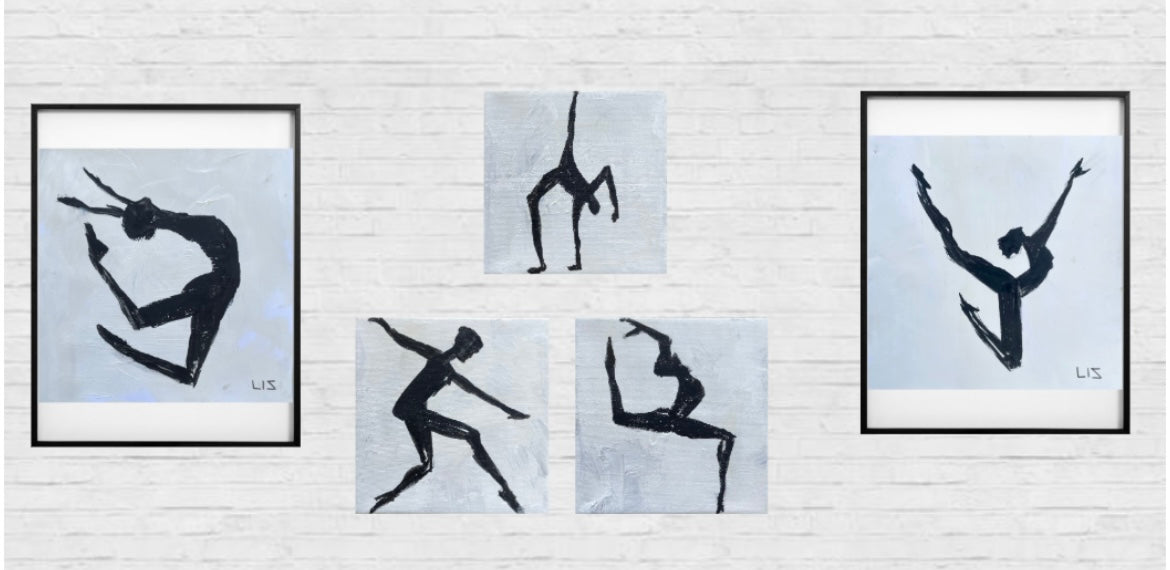 Each work captures a moment suspended between tension and release, rendered in bold black and colorful forms that suggest both strength and vulnerability.